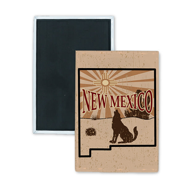 907-31 New Mexico Zia Sun & Coyote State Shape Rectangle Badge Magnet