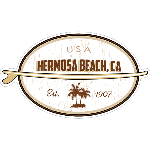 1237-553 Hermosa Beach CA Coastal Wood Grain Oval with Surfboard Sticker