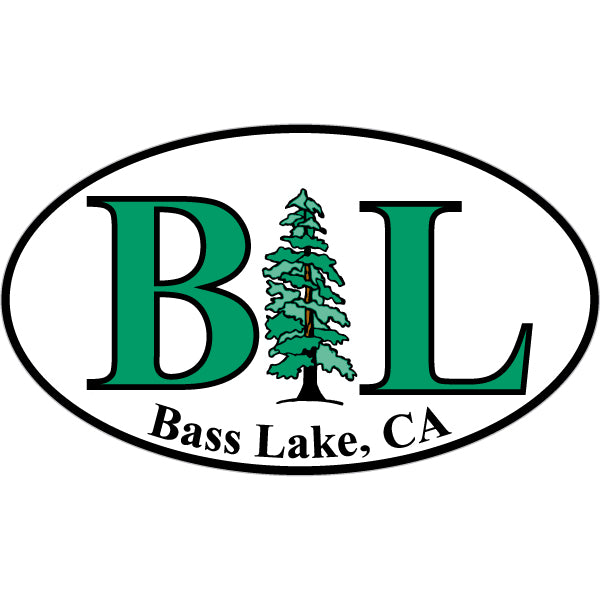 283-1097 Bass Lake CA Pine Tree Euro Oval Sticker